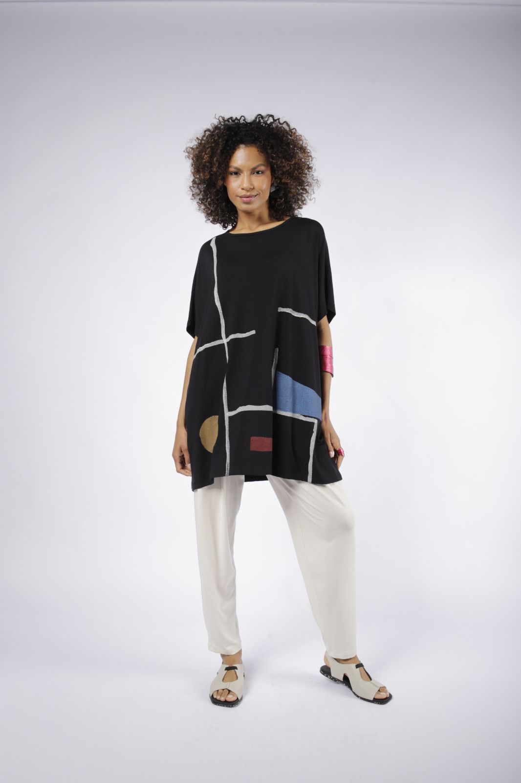 A estampa artesanal torna cada peça única, destacando o cuidado e a originalidade em cada detalhe. Leve e versátil, é ideal para montar looks modernos e confortáveis em qualquer ocasião.