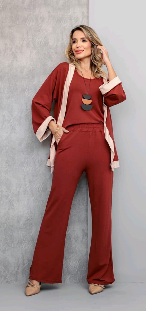 Conjunto de três peças em viscolycra na cor terracota, que une elegância, conforto e versatilidade. Composto por calça reta com cós elástico, regata básica e casaco leve de manga ampla, é a escolha ideal para quem busca praticidade sem abrir mão do estilo.
