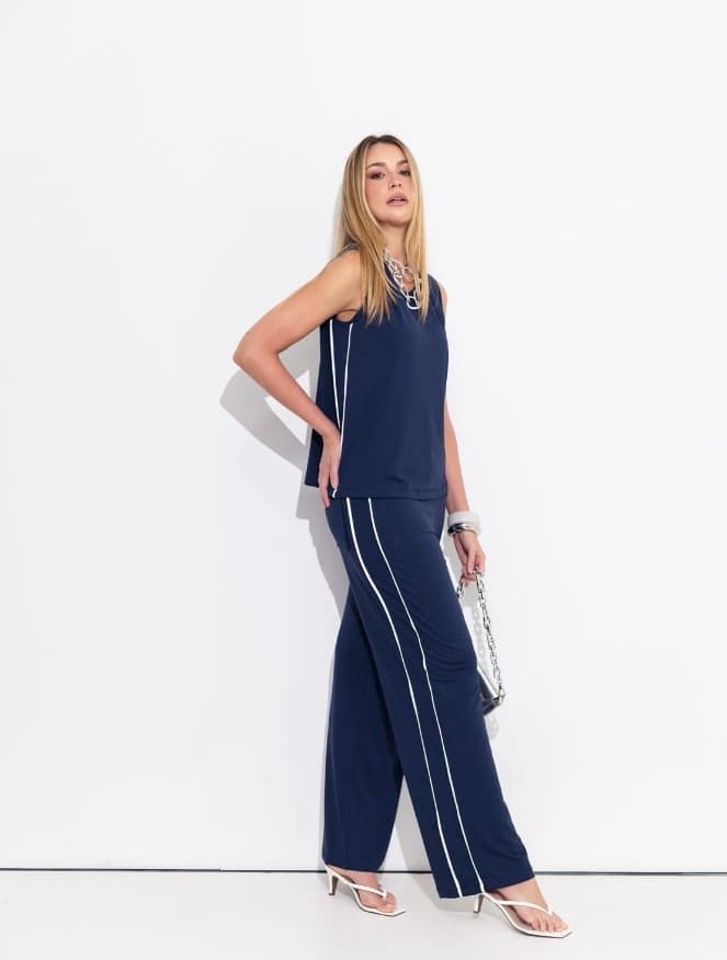 O grande diferencial está nos vivos laterais em contraste, que criam uma linha vertical contínua da blusa até a barra da calça, proporcionando um efeito visual que alonga e afina a silhueta. A regata possui um corte estruturado e fluido, enquanto a calça reta oferece movimento e extremo conforto.